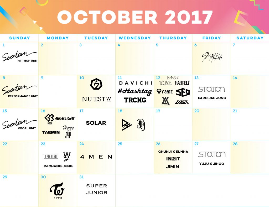 10/1 SEVENTEEN Hip-Hop Unit – Trauma 10/6 Stray Kids – Hellevator 10/8 SEVENTEEN Performance Unit – LILILI YABBAY 10/10 GOT7 – YOU ARE 10/10 NU’EST W – WHERE YOU AT 10/11 Davichi – To Me 10/11 HASH TAG (debut) – Hue 10/11 TRCNG (debut) – Spectrum 10/12 DIA – Good Night 10/12 HA:TFELT – I Wander (ft. Gaeko) 10/12 MASC – Do it 10/12 RAINZ (debut) – Juliette 10/12 SF9 – O Sole Mio 10/12 UP10TION – Going Crazy 10/12 VARSITY – Can You Come Out Now? 10/13 Parc Jae Jung – The Villain 10/13 [STATION] Doyoung (NCT) X Sejeong (Gugudan) – Star Blossom 10/16 SEVENTEEN Vocal Unit – Pinwheel 10/16 BTOB – Missing You 10/16 Highlight – Can Be Better 10/16 JYP X Heize – Regrets 10/16 Taemin (SHINee) – MOVE 10/17 Solar (Mamamoo) – Autumn Letter 10/18 A.C.E – Callin 10/18 JBJ (debut) – Fantasy 10/23 Epik High – Home Is Far Away (ft. Oh Hyuk) + Love Story (ft. IU) 10/23 Im Chang Jung – Do You Know That Person 10/23 Wheesung – Aroma (ft. Hash Swan) 10/26 4MEN – Break Up In The Morning 10/26 Chunji (Teen Top) X Eunha (GFriend) – Hold Your Hand 10/26 IN2IT (debut) – Amazing 10/26 Jimin (AOA) – Hallelujah 10/27 [STATION] Kang TA X Wendy & Seulgi (Red Velvet) – Doll 10/27 Yuju (Gfriend) X Jihoo (IZ) – Heart Signal 10/30 TWICE – LIKEY 10/31 Super Junior – One More Chance