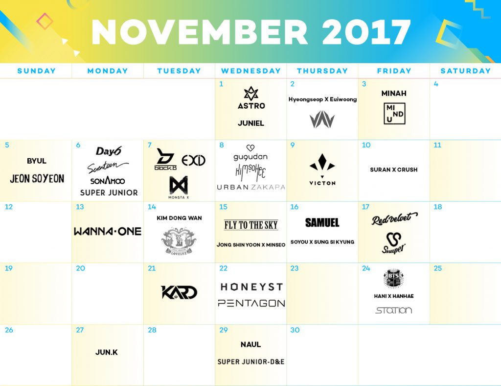 11/1 ASTRO – Crazy Sexy Cool 11/1 Juniel – I Drink Alone 11/2 [Debut] Hyeongseop X Euiwoong – It Will Be Good 11/2 VAV – She’s Mine 11/3 Minah (Girl’s Day) – 11° 11/3 Mind U – If 11/5 Byul – Leaves (Ft. Junoflow) 11/5 [Debut] Jeon Soyeon – Jelly 11/6 Day6 – All Alone 11/6 Seventeen – CLAP 11/6 SONAMOO – I (knew it) 11/6 Super Junior – Black Suit 11/7 Block B – Shall We Dance 11/7 EXID – DDD 11/7 Monsta X – DRAMARAMA 11/8 Gugudan – Chococo 11/8 [Debut] Kim Sohee – The Fillette (Ft. Yezi) 11/8 Urban Zakapa – When We Were Two 11/9 VICTON – Remember Me 11/10 Suran X Crush – Love Story 11/13 Wanna One – Beautiful 11/14 Kim Dong Wan – AFTERIMAGE 11/14 Lovelyz – Twinkle 11/15 Fly To The Sky – Your Season 11/15 Jong Shin Yoon X MINSEO – Yes 11/16 Samuel – Candy 11/16 Soyou X Sung Si Kyung – I Still 11/17 Red Velvet – Peek-A-Boo 11/17 SNUPER – Dear 11/21 KARD – You In Me 11/22 Honeyst – Someone To Love 11/22 Pentagon – RUNAWAY 11/24 BTS – MIC Drop (Steve Aoki Remix) 11/24 Hani (EXID) X Hanhae – Eyes 11/24 [STATION] d.ear X Jaehyun (NCT 127) 11/27 Jun.K (2PM) – A Moving Day 11/29 Naul (Brown Eyed Soul) – Emptiness In Memory 11/29 Super Junior-D&E – Here We Are