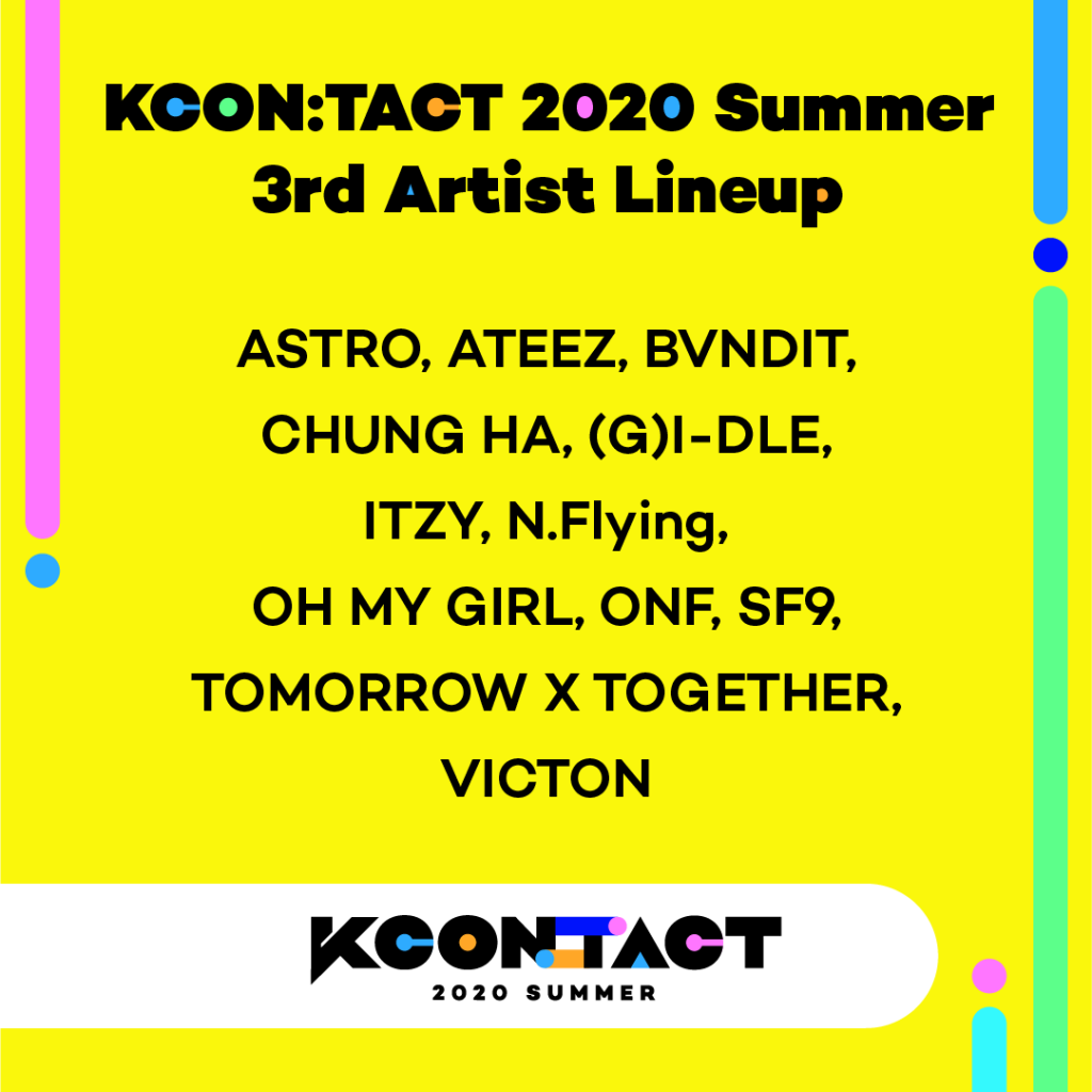 Hi, KCON-ers! We're back with the 3rd KCON:TACT artist announcement! The third group of 10 artists attending KCON:TACT are ASTRO, ATEEZ, BVNDIT, CHUNG HA, (G)I-DLE, ITZY, N.Flying, OH MY GIRL, ONF, SF9, TOMORROW X TOGETHER, and VICTON. KCON:TACT 2020 SUMMER (June 20-26) is a marathon stream of live and pre-taped content and will air seven full days in a row. You can expect to see a mix of live concerts, live meet and greet sessions, behind the scenes content, artist + influencer collaboration content, and influencer panels like those that can be found in-person at KCON events. Fans can see all the KCON:TACT action by becoming an Mnet K-Pop YouTube member ($19.99). Curious about what the artists will be doing at KCON:TACT? The interactive programs are set to include over 30 K-Pop artists who fans will be able to interact with via live video chats, live polls, and much more. Among the currently announced programming there is: 1) “24hr Idol” which follows one group for an entire day in their life. 2) KCON:TACT Backstage Behind which takes you backstage with the artists 3) A four-hour concert + meet and greet event featuring four artists every day of KCON:TACT. That means from June 20 to June 26 you’ll have four, full hours of concert + meet & greet programming each and every day--not to mention all of the other artist programs like “Backstage Behind” and “24hr Idol.” KCON:TACT concert performances are different than anything you’ve ever seen at KCON. You can expect state-of-the-art stages uniquely created for each night and the ability for you to participate directly in the show. The goal is for fans to be a part of a highly immersive experience using the latest VR and AR technology. The entire KCON:TACT 2020 SUMMER stream will be broadcast exclusively via the Mnet K-Pop YouTube channel (www.youtube/mnet) with English subtitles. All interactive elements, including direct artist communication, will be available only through YouTube. A portion of all proceeds will go to UNESCO’s Learning Never Stops campaign to help children impacted by COVID-19 around the world to continue their education. Check out the KCON:TACT 2020 SUMMER 3rd Artist Lineup below! ASTRO ATEEZ BVNDIT CHUNG HA (G)I-DLE ITZY N.Flying OH MY GIRL ONF SF9 TOMORROW X TOGETHER VICTON KCON:TACT Artist Announcement – VICTON