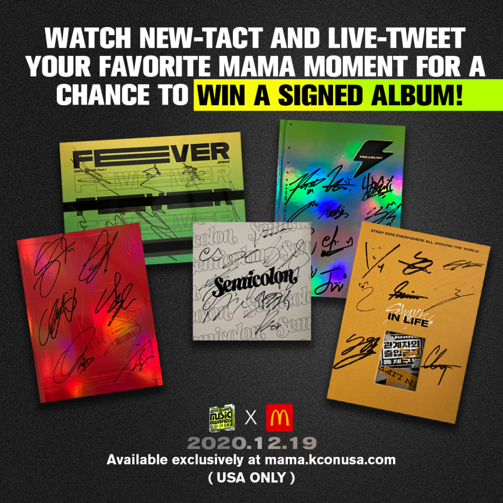 NEW-TACT ARTIST-SIGNED ALBUM SWEEPSTAKES FOLLOW THE INSTRUCTIONS BELOW TO ENTER TO WIN AN ARTIST-SIGNED ALBUM! OFFICIAL RULES NO PURCHASE OR PAYMENT OF ANY KIND IS NECESSARY TO ENTER OR WIN THE SWEEPSTAKES. A PURCHASE WILL NOT INCREASE ENTRANT’S CHANCES OF WINNING. ODDS OF WINNING WILL DEPEND ON THE TOTAL NUMBER OF ENTRIES RECEIVED. VOID WHERE PROHIBITED BY LAW. MINORS 13 AND OLDER WILL NEED THEIR PARENT’S OR LEGAL GUARDIAN’S PERMISSION TO WIN THE SWEEPSTAKES (SEE AVAILABLE CONSENT FORM). SWEEPSTAKES DESCRIPTION & ELIGIBILITY: New-Tact Artist-Signed Album Sweepstakes (the “Sweepstakes”), sponsored by CJ ENM America, Inc. (collectively, the “Sponsor”), shall begin at 3:00 p.m. EDT/12:00 p.m. PDT on December 18, 2020 and end at 8:00 p.m. PDT on December 19, 2020 (the “Promotion Period”). The Sweepstakes is open only to legal residents of the contiguous United States and the District of Columbia (excluding residents of Rhode Island and Maine) (the “Eligibility Area”) and who comply with these Official Rules in all respects. Participation in the Sweepstakes is limited to individuals eighteen (18) years or older (19 years or older in AL and NE, 21 years or older in MS) and minors thirteen (13) years or older (a “Minor”) with parental consent documented in a completed the New-Tact Artist-Signed Album Sweepstakes Parental/Guardian Consent Form (“Consent Form”). Minors who do not submit a completed Consent Form are ineligible to win. Employees, officers, and directors of Sponsor or Sponsor’s parents, subsidiaries, and affiliates, and the immediate family members of such individuals (spouse, parents, siblings, children, legal guardians, in-laws, grandparents, and grandchildren) and members of the same households (whether legally related or not) of such individuals, are not eligible to enter or win. By entering the Sweepstakes, you (an “Entrant”) or your parent/legal guardian, if applicable, accept and agree to be bound by these Official Rules and the decisions of Sponsor, including the interpretation of these Official Rules, which shall be final and binding in all respects. These Official Rules include limitations of your rights and remedies. The Sweepstakes is void outside the Eligibility Area and wherever prohibited by law or where the registration or filing requirements of any state or local jurisdiction have not been complied with. HOW TO ENTER: You may enter this Sweepstakes one of two ways: Entry: Upon completing all steps below, you will receive one (1) automatic entry into the Sweepstakes. Any subscriptions/follows must be active throughout the Sweepstakes duration. Follow @kconusa on Twitter; Post a live tweet with your Twitter username with your favorite MAMA 2020 moment Tag @kconusa on your post Use #NEWTACT2020 This call-to-action is subject to change at Sponsor’s sole discretion. Mail-In Entry: Legibly print your full name, postal address, valid e-mail address, phone number, and date of birth on a piece of paper or a 3” x 5” index card, write down your favorite MAMA moment from the NEW-TACT stream, and mail it in to CJ ENM America, Inc., Attention: NEW-TACT Artist-Signed Album Sweepstakes, 1600 Rosecrans Ave., Bldg. 2A, Ste. 301, Manhattan Beach, CA 90266. To be eligible for the Sweepstakes, mail-in entries must be postmarked by December 21, 2020 and received by Sponsor no later than December 28, 2020. If Entrant is a Minor, entry must include a valid, signed Consent Form. NO PURCHASE OR PAYMENT OF ANY KIND IS NECESSARY TO ENTER OR WIN THIS SWEEPSTAKES, AND PURCHASE DOES NOT IMPROVE ODDS OF WINNING. Sponsor’s database clock will be the official timekeeper for this Sweepstakes. ENTRIES ARE LIMITED TO ONE (1) ENTRY PER PERSON AND THEIR CORRESPONDING VALID SOCIAL MEDIA ACCOUNT(S). Subsequent attempts made by the same individual to submit multiple entries by using multiple accounts on the same platform, or otherwise, may be disqualified. Entries are void if they contain typographical, printing or other errors. No entries from automatically generated e-mail addresses shall be accepted. Use of any automated system, such as script, macro, or other automated means, to participate or generate entries (or otherwise assist in participation) is strictly prohibited and will result in disqualification. Entries that are mutilated, altered, lost, late, inaccurate, incomplete, tampered with, unintelligible, illegible, forged, or otherwise not in compliance with these Official Rules will also result in disqualification. Any false or deceptive entries or acts will render all entries by an Entrant ineligible. The envelope containing a mail-in entry must not include entries for other persons (i.e., no bulk submissions). As a condition of entering the Sweepstakes, each Entrant (or if Entrant is a minor, said Entrant’s parent or legal guardian) gives consent for Sponsor to obtain and deliver his or her name, address and other information to third parties for the purpose of administering this Sweepstakes and complying with applicable laws, regulations and rules. In the event of a dispute over the identity of an Entrant, entry will be deemed submitted by the authorized account holder of the e-mail address, which the Entrant will have the obligation to establish. The “authorized account holder” is defined as the person assigned to an e-mail address by an Internet access provider, online service provider and/or other organization responsible for assigning e-mail addresses. All materials submitted become the exclusive property of Sponsor and will not be returned. In the event a dispute regarding the identity of the individual who actually submitted an entry cannot be resolved to Sponsor’s satisfaction, the affected entry will be deemed ineligible. Illegible and/or incomplete entries and entries submitted by Entrants who do not meet the eligibility requirements (including all requirements with respect to age and residence) are void. The Sponsor and any and all 