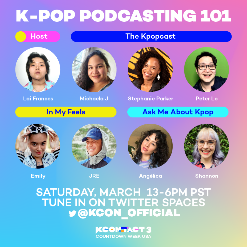 KCON:TACT 3 COUNTDOWN WEEK USA is in full force! To end off a fun week full of zoom sessions and getting to spend some time with our special guests, we'll be having a finale using the all new Twitter Spaces! Everyone's been listening to podcasts during quarantine right? What better way to end the week than to learn more about K-Pop Podcasts! Meet our special guests who'll be sharing their tips, tricks, and more! Lai Frances Lai Frances is a multimedia journalist and host who made bylines on MTV News, PopCrush, and tmrw. Immersing herself for over a decade, Lai has gone from a fan to a professional raving about all things Hallyu on social media to entering the media industry, interviewing artists and talking about K-pop on The Korea Society, New York Comic Con, and of course, KCON. You probably know her better as the host on BUILD Series with her live interviews with DAY6 and ITZY. Ask Me About K-Pop Angélica Angélica is the host of the educational Kpop podcast, Ask Me About Kpop, and a member of Unos Kpop Dance troupe . When not teaching or kpop-ing, Angélica enjoys doing yoga, trying new recipes, and trying to keep her cat, Cookie, from eating all her houseplants. Shannon Shannon is the host of the educational Kpop podcast, Ask Me About Kpop. She is also lead singer of the band Townland, and a member of Unos Kpop Dance troupe. When not singing or kpop-ing, Shannon enjoys crafts like knitting and needle felting and watching too much tv and playing video games with her husband, Wade. In My Feels Emily Emily hosts the In My Feels podcast with JRE along with producing other podcasts. She lives in Seoul right now teaching English and freelancing in marketing/communication roles! JRE JRE is K-POP Content Creator on YT and Streams on Twitch too. The Kpopcast Michaela J Michaela is the lead producer, main vocal and hidden visual of the Kpopcast. She began training as a Hallyu fan since 2009, and debuted with the Kpopcast in 2018. Her hidden talent is watching K-dramas without subtitles and her ideal type is a BoA stan. Peter Lo Peter Lo is a K-pop DJ and the founder behind The Kpopcast - a weekly podcast curating the best sounds and ideas in K-pop. Between gigs and episodes, he writes K-pop satire stories in the style of the Onion for All K-Boo News. Stephanie Parker Stephanie hails from Oakland California and there's a proud cohost of the Kpopcast, we are she brings a race conscious critical lens, insights from her work at companies like SOOMPI, Viki, and YouTube, and a healthy dose of spicy commentary. Fun fact: Stephanie used to host the KCON Kdrama panel back in the day when there was only one! Don't forget to follow @KCON_Official on Twitter! Stay safe and take care everyone! -KCON Staff NEW-TACT ARTIST-SIGNED ALBUM SWEEPSTAKES