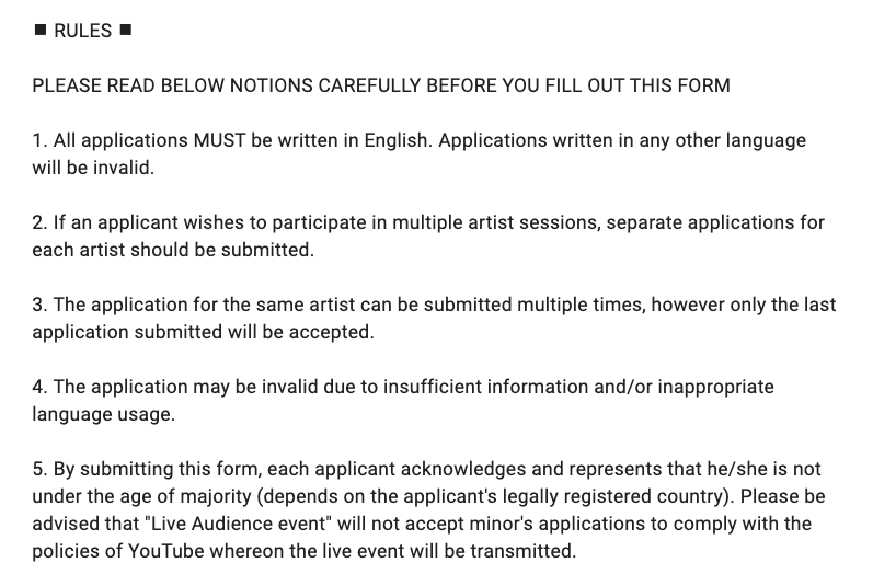 Finally, we also want to address one more thing and that is age restrictions. The only campaign which has an age restriction is “Live KCON-ers” and participants must have been born before June 20, 2000. This is due to international broadcast rules and the various definitions of the term “minor” from country to country. We will go through why that is in the “Live KCON-ers” section below. However, we want to say this clearly: Since all (3) campaigns are submitted on the same Google form and (1) campaign has an age restriction, we ask that if you are a minor that you mark “No” on the Y/N question, “I wish to participate in 1:1 live interactive with my favorite artist.” You may of course participate in the other two events and fill out the form accordingly.