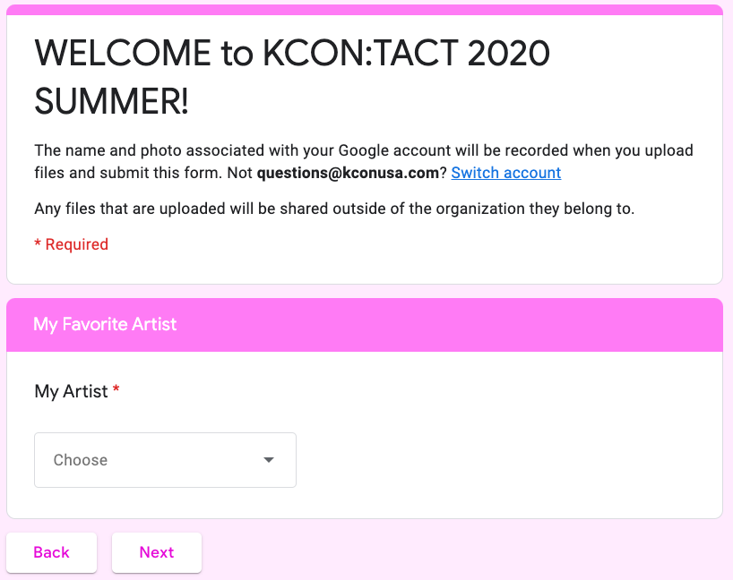 Can I do multiple submissions?: If your multiple forms are for separate artists then yes. Please make sure each form submission only contains questions/information for the artist you choose on PAGE 2. Do not submit a “KCON Wish” for CRAVITY and a “Live KCON-ers” question for CHUNG HA. You must submit separate forms for separate artists. It is this way so that we can easily review all of the submissions for each artist.