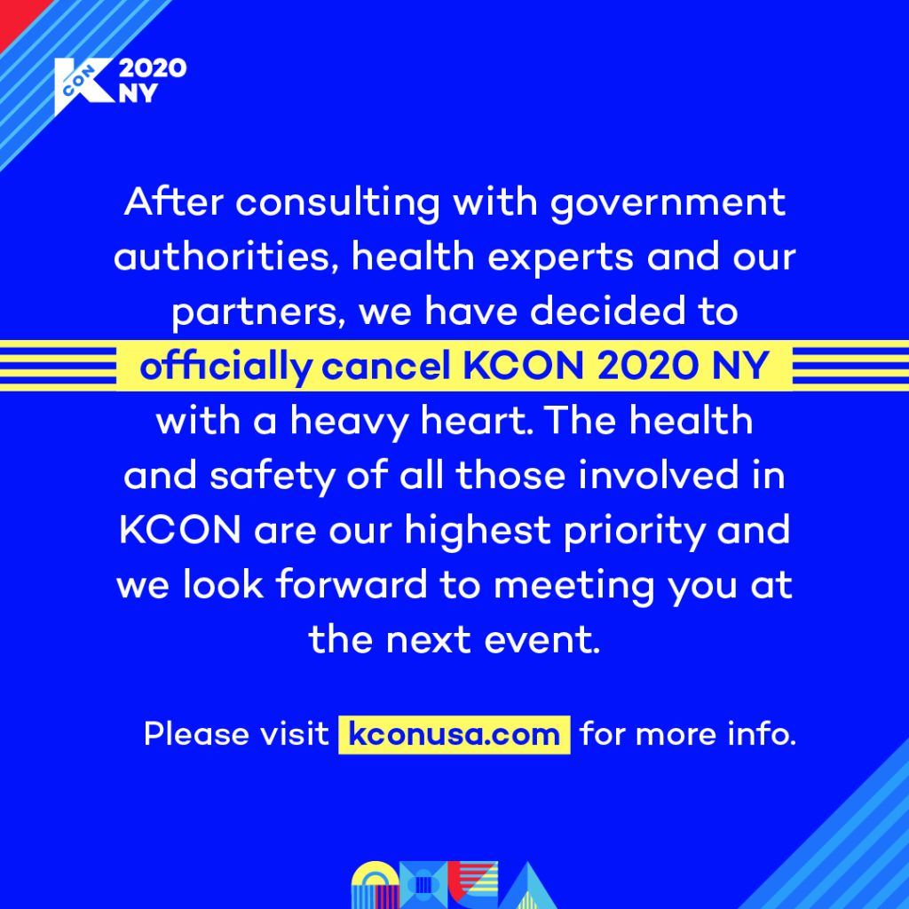 The KCON USA team has been closely monitoring the situation around the coronavirus (COVID-19) pandemic. The health and safety of all those involved with all of our events – fans, artists, employees, exhibitors, partners, and more – is our highest priority. After many conversations with the appropriate government authorities, health experts and our partners, it is with deep sadness that we have decided to cancel KCON 2020 NY, scheduled for June. All tickets previously purchased will be refunded. Please refer to the FAQ page for more information. At this time, we are monitoring the situation closely as we plan for KCON 2020 LA. We will continue to provide updates as we work with the venues and the authorities to ensure the safety of everyone at our event. For more updates, please visit our website (www.kconusa.com) and follow us on social. Thank you for your understanding and continued support. Please stay safe and healthy.